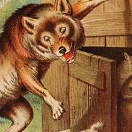 Es dauerte nicht lange, da klopfte jemand an die Haustür und rief: "Macht auf, ihr lieben Kinder, eure Mutter ist da und hat jedem von euch etwas mitgebracht!" Aber die Geißlein hörten an der rauhen Stimme, daß es der Wolf war. "Wir machen nicht auf," riefen sie, "du bist unsere Mutter nicht, die hat eine feine und liebliche Stimme, aber deine Stimme aber ist rau; du bist der Wolf." Da ging der Wolf fort zu einem Krämer und kaufte sich ein großes Stück Kreide; er aß es auf und machte damit seine Stimme fein. Dann kam er zurück, klopfte an die Haustür und rief: "Macht auf, ihr lieben Kinder, eure Mutter ist da und hat jedem von euch etwas mitgebracht!" Aber der Wolf hatte seine schwarze Pfote in das Fenster gelegt, das sahen die Kinder und riefen: "Wir machen nicht auf, unsere Mutter hat keinen schwarzen Fuß, wie du; du bist der Wolf!" Da lief der Wolf zu einem Bäcker und sprach: "Ich habe mich an den Fuß gestoßen, streich mir Teig darüber." Als ihm der Bäcker die Pfote bestrichen hatte, so lief er zum Müller und sprach: "Streu mir weißes Mehl auf meine Pfote." Der Müller dachte: Der Wolf will einen betrügen, und weigerte sich; aber der Wolf sprach: "Wenn du es nicht tust, fresse ich dich!" Da fürchtete sich der Müller und machte ihm die Pfote weiß. Ja, so sind die Menschen.